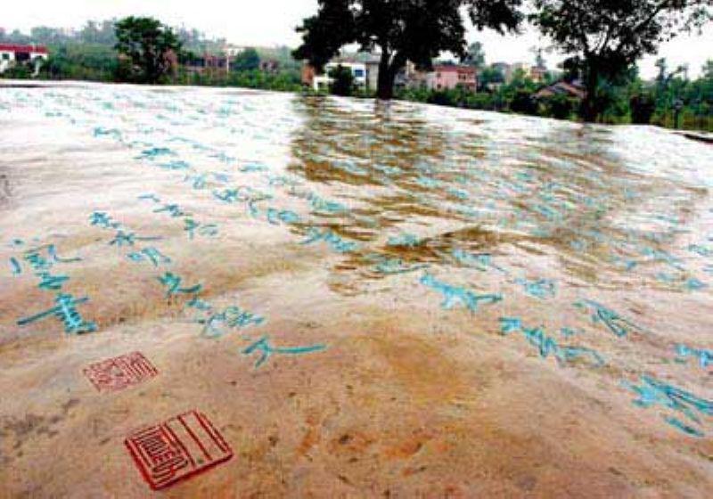 據書寫該賦的我市知名書法家、本報編輯張弢介紹,當時把這賦轉移到巨石上頗費了些周折,“是書法與現代科技的結合!”書寫后先掃描到電腦里放大,然后制作出一張500多平方米的大紙,鋪在巨石上。接著,將字體部分挖空,用刷特制漆涂在上面,最后風干后揭開紙,于是,巨大的文字便成功“印”在了巨石上。這項工程動用了20名工匠,耗時整整兩個月才完成!